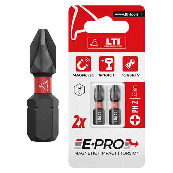 In acciaio S2 ad alta resistenza. Durezza 60HRC. Attacco 1/4". Lunghezza 25 mm. Per avvitatori manuali, elettrici e pneumatici. In blister da 2 pezzi.