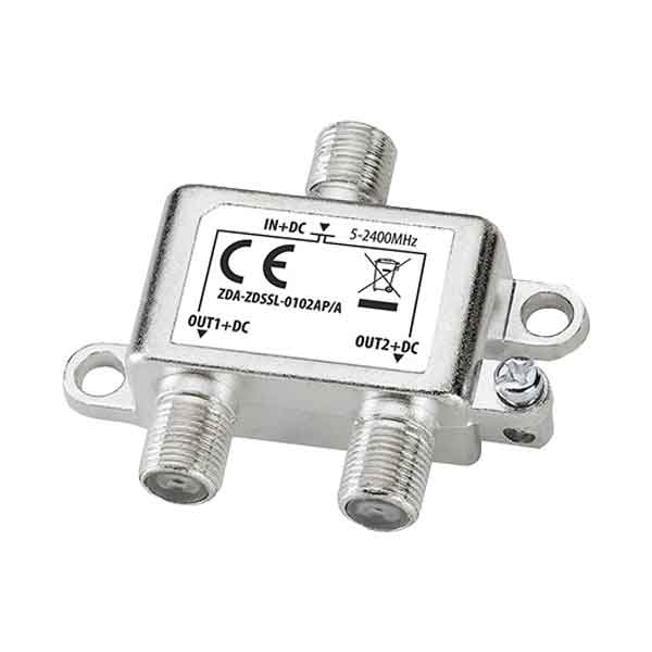Cassa in zinco pressofuso. Facile installazione grazie ai due fori predisposti per fissaggio a vite. Fattore di schermatura: 5-2400 mhz ≥ 100db. Progettato per impianti satellitari e digitali terrestri. Potenza di passaggio -24 v 0,8 a(max.) Connettori F a spina a 75 ohm.